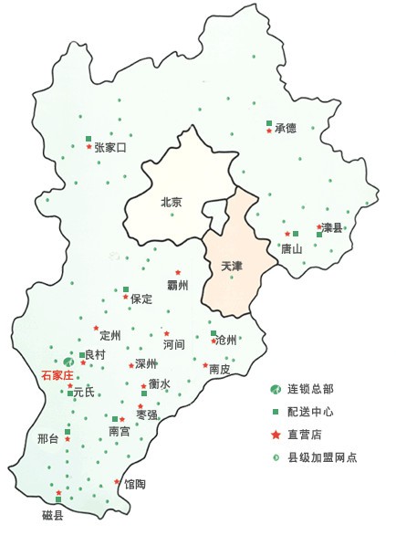 河北省農業生產資料集團有限公司十分重視市場營銷網絡建設 , 充分利用供銷社內外資源,用現代流通方式改造傳統經營網絡,大力發展農資連鎖經營。自1998年開始在全省及周邊省份組建分公司,2002年發展縣鄉分銷網點, 2005年啟動以“河北農資豐澤苑”為統一品牌的農資連鎖經營網絡工程,通過大力實施農資配送中心建設、終端網絡體系升級改造建設、農化服務體系建設和農資信息服務體系建設,已經構建起以省農資公司為龍頭,以區域配送中心為骨干,以縣市分銷中心為依托,以鄉村農資連鎖店為基礎,覆蓋全省、輻射周邊、上下貫通、流通有序的現代農資經營服務網絡體系。目前,區域配送中心16個,縣級分銷(配送)中心156個,鄉村加盟(直營)店3000多家。