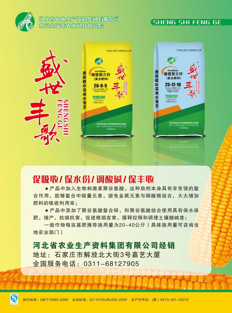 “盛世豐歌”牌聚能鰲合鋅肥是河北省農(nóng)資集團(tuán)依托華中農(nóng)業(yè)大學(xué)專利技術(shù),開發(fā)、研制的新一代資源節(jié)約型和環(huán)境友好型的生物高聚能型改良產(chǎn)品,該產(chǎn)品是根據(jù)河北廣大地區(qū)的土壤狀況結(jié)合玉米全生長期的營養(yǎng)需求,對大量元素進(jìn)行科學(xué)配比的基礎(chǔ)上,以純生物聚能營養(yǎng)劑-聚谷氨酸為核心增效動(dòng)能,特別融入玉米生長所必需的生態(tài)螯合鋅和螯合鎂,通過高科技納米技術(shù)和智能調(diào)控手段,經(jīng)高塔工藝精制而成,為作物生長的各個(gè)階段提供充足的營養(yǎng),同時(shí)還有效避免了無效養(yǎng)分的囤積和浪費(fèi)。