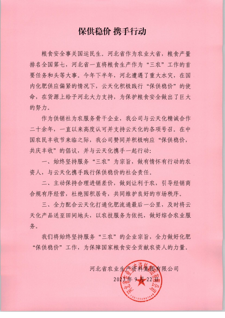 保供穩(wěn)價(jià) 攜手行動(dòng)—— 集團(tuán)公司響應(yīng)云天化倡議書(shū)